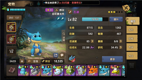 值得一提的是,当驯兽师达到65级后,可以通过单人活动的调查任务,专刷一只水属性的幼年暴龙,因为在《新石器时代》里面,水属性的摩卡左迪比小红暴摩卡更加实用,它的生存能力更强,它的必杀能对敌方随机3个目标造成攻击伤害,同时回复24%造成伤害的生命值,并有80%概率造成灼烧状态,持续3回合!能输出能回复生命值,它对比小红暴更加值得驯兽师们重点培养!