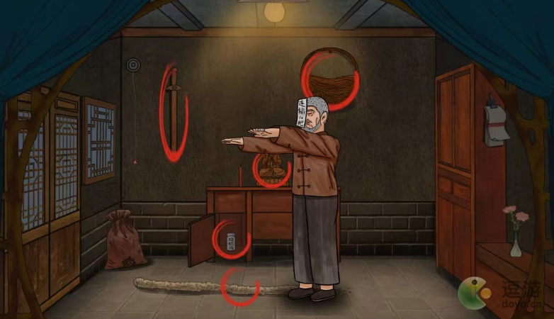 4、然后进入屋内,点击桃木剑、诡异篮子、无头观音、安眠药(向下滑动柜子的门,打开柜子)、糯米