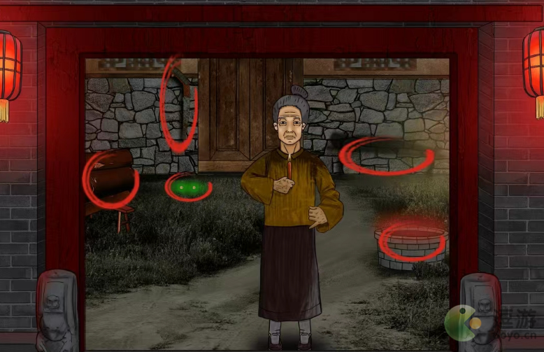 3、等大门打开后,点击绿眼睛、棺材、井中红光、锯子、直挺挺的影子