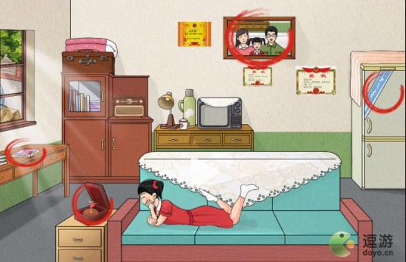 2、然后进入第二个场景,点击八音盒、桌子上的本子、冰箱、全家福合照