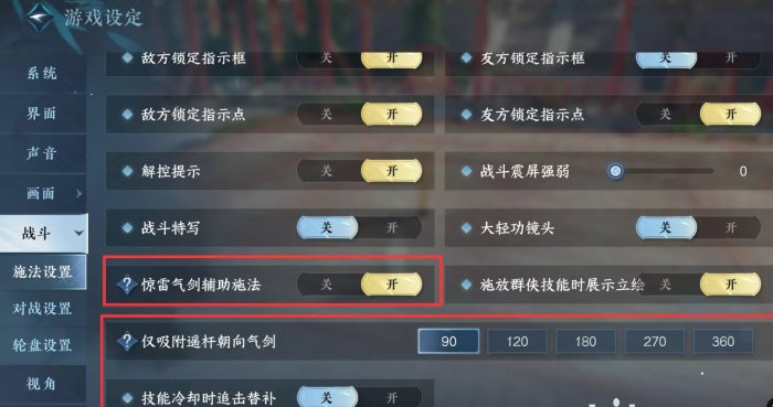惊雷冷却追击替补关的原因是,首先会导致我们的剑意循环错乱,其次也会影响到部分技能的追击循环,吸附摇杆剑气的角度,角度越小越方便自己练操作,推荐是90-120如果选到360,就会出现剑在背会的时候,你使用惊雷直接把你镜头调转然后冲到气剑方向的情况,换言之,角度越小操作误差会更小,更容易控制,还有在某些特定情况下如果想用惊雷跑路,设置里面要调整一个选自己的快捷键,这样在选自己之后,使用惊雷就可以朝自己的面向突进了