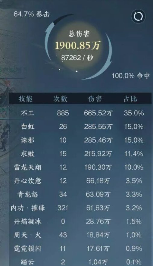 接下里我们看一下简单的伤害分布,基本来源于普攻所以整体的内功搭配