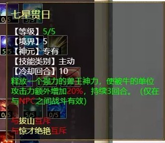 第二个大招叫七星贯日,任务专用,被牛单位额外增加攻击力,也是是需要100点怒气的主动技,冷却10回合。我们都知道,带大力的任务队,基本就是一至两回合结束战斗的,哪怕是BOSS,也很少有让敏牛魔能拖到100怒气用大招牛的机会,所以这个技能同样没用,之前建议放弃大招,将“气冲斗牛”和“月涌大江”点满就是这个原因。