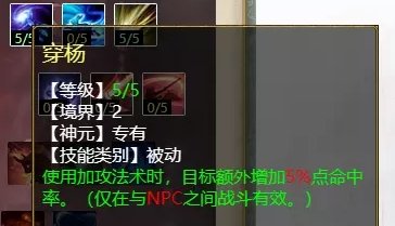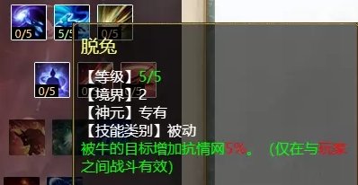 强牛第二层有三个技能,分别是:穿杨(任务专用,为被牛的单位增加命中率),脱兔(PK专用,为被牛的单位增加抗情网),溯光(任务、PK通用,增加自身的反击次数)。