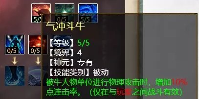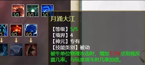 强牛第三层有三个技能,分别是:气冲斗牛(PK专用,为被牛的单位增加连击率),灿星(任务、PK通用,增加自身狂暴率),月涌大江(任务、PK通用,为被牛的单位增加抗反震率)