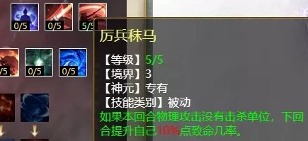 强牛第一层有三个技能,分别是:追命(任务、PK通用,被牛的单位几率增加连击次数1),星垂平野(任务专用,牛法增加1回合),翻浪(任务、PK通用,增加自身的反击几率)。