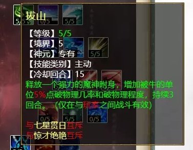 第一个大招叫拔山,PK专用,增加被牛单位的双破物理,是需要100点怒气的主动技,冷却15回合,当天枢点达到85点,可点满大招第二层,可额外增加被牛单位的命中率和攻击力。晓霜觉得该技能实战中意义不大,双天赋魔更多侧重于盘或者速,牛只是附加属性,属性锦上添花型,不是必要型,所以这个大招基本没人会用。