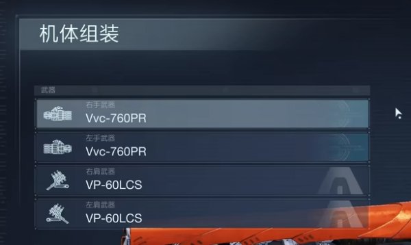 右手武器【Vvc-760PR】、左手武器【Vvc-760PR】、右肩武器【VP-60LCS】、左肩武器【VP-60LCS】。