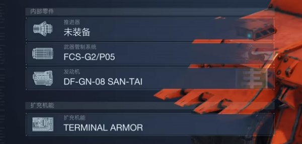 推进器(无)、武器管制系统【FCS-G2/P05】、发动机【DF-GN-08 SAN-TAI】、扩充机能【TERMINAL ARMOR】。