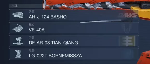 头部【AH-J-124 BASHO】、核心【VE-40A】、手部【DF-AR-08 TIAN-QIANG】、足部【LG-022T BORNEMISSZA】。