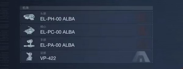 头部【EL-PH-00 ALBA】、核心【EL-PC-00 ALBA】、手部【EL-PA-00 ALBA】、足部【VP-422】。