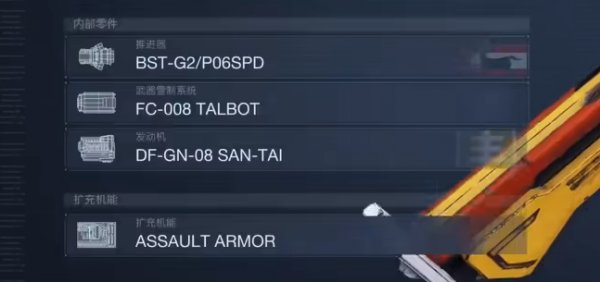 推进器【BST-G2/P06SPD】、武器管制系统【FC-008 TALBOT】、发动机【DF-GN-08 SAN-TAI】、扩充机能【ASSAULT ARMOR】。