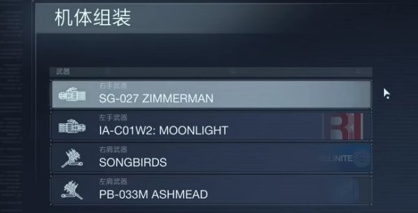 右手武器【SG-027 ZIMMERMAN】、左手武器【IA-C01W2:MOONLIGHT】、右肩武器【SONGBIRDS】、左肩武器【PB-0330M ASHMEAD】。