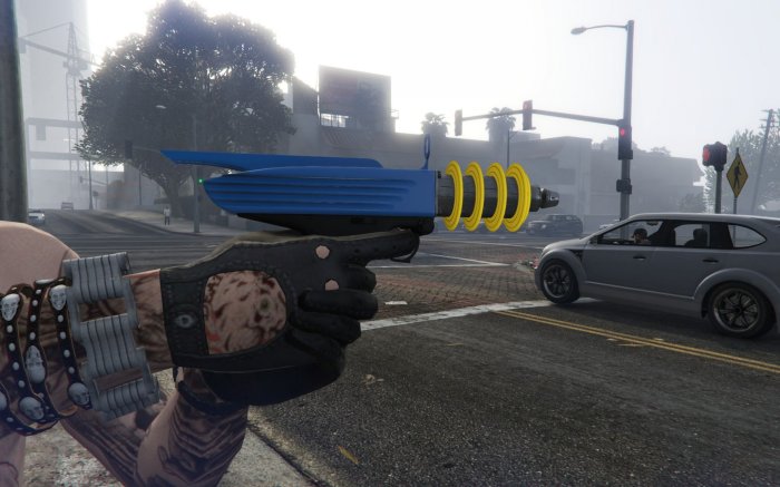 4.原子能枪主要用于与朋友间的娱乐,也能欺负开车的NPC,但是也能依靠它来拆除无法通过的路障,用它来翻越无法攀爬的高墙,还能用它将四脚朝天的载具翻回来