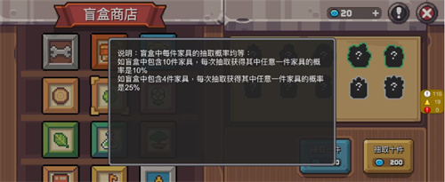有意愿购置稀有家具,通过内部的盲盒体系实行抽取。盲盒体系位于秋梨服装店的最深层区域,按照靠右侧沿着盲盒设施行动便可实行盲盒的抽取操纵。每次单抽出价20颗蓝宝石,十次大抽需花费200颗蓝宝石。盲盒抽取耗费的金额不算少,实行抽取前确保自身已准备好充足的宝石。
