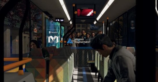 4、公交车上,为了防止人类与仿生人产生冲突,特地用隔离网将双方分开。