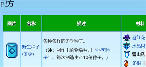 除利用挖掘雪地的方法,还有一种替代的途径可以获取雪山药,即通过种植冬季种子。冬季种子是一种野生种子,其特点在于可以在冬季生长,能够产出雪山药、番红花、水晶果和冬根等多种农作物。制作冬季种子的方法是将上述四种野菜各取一份进行组合,一次制造便能获得10份种子。在冬季的鹈鹕镇和沙漠地区也可以寻找冬季种子,有时候会有幸找到。种植冬季种子的好处在于,不需要使用锄头进行收获,只需手摘即可,每次摘取雪山药时还能获得高达7点的采集经验。
