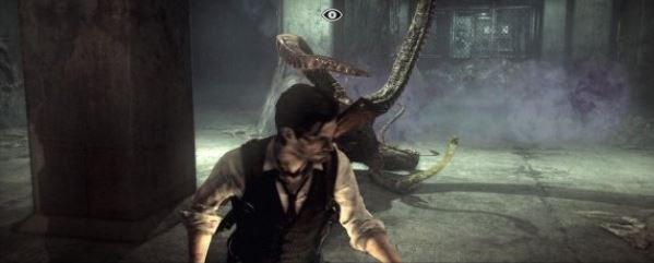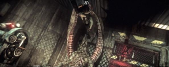 当我们想要重新启动发动机,连通电源之时,墙上忽然出现了隐身虎视眈眈的触手怪物,一把将我们抓起扔向了中央的场地中去