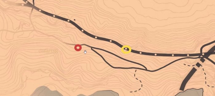 获取方式还是随机事件(一位女士的马匹死了,需要我们带她回翡翠牧场),也可以做摄影师第三部分抓野马。红圈是刷新点,我们需要站在黄圈这里。用带瞄准镜的步枪射杀NPC,直到刷出一匹站着的马。