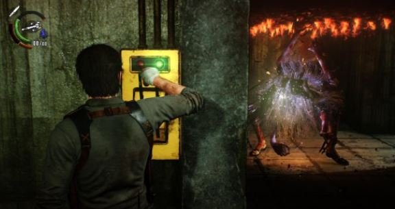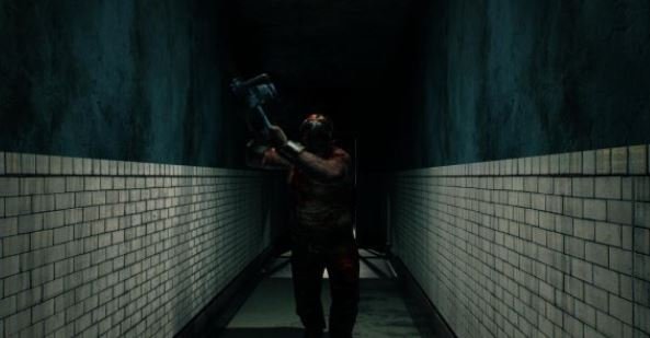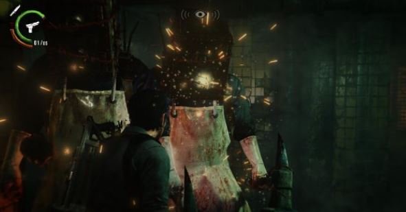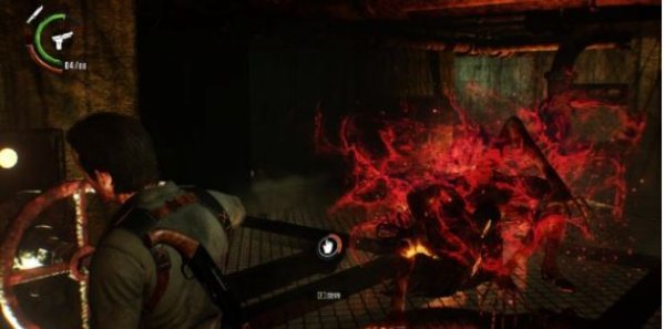 接下来会出现的就是贞子了。贞子会利用地上的尸体凝聚出自己的身体快速移动,被她近身后就会直接把你打死。所以绝对不能被追到。但是这块区域有比较多的电击弩箭,先将两个阀门转动,转动时长比较长,先利用电击弩箭使之麻痹。两个阀门都转动后中央在拉下闸门后就会喷出火焰。将贞子引诱到这个位置,利用电击弩箭使它停留在这片区域后,拉下闸门,将它烧死。
