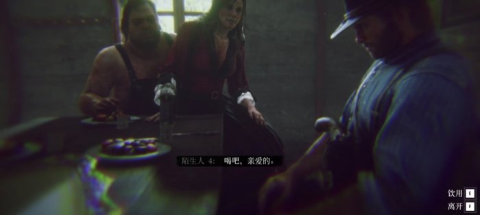 进入后,食人兄妹会邀请我们喝酒(酒里有毒)。