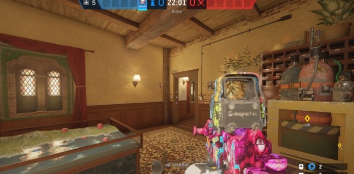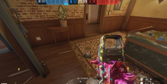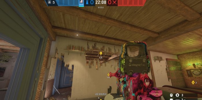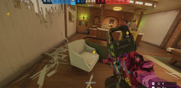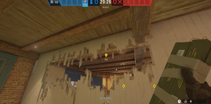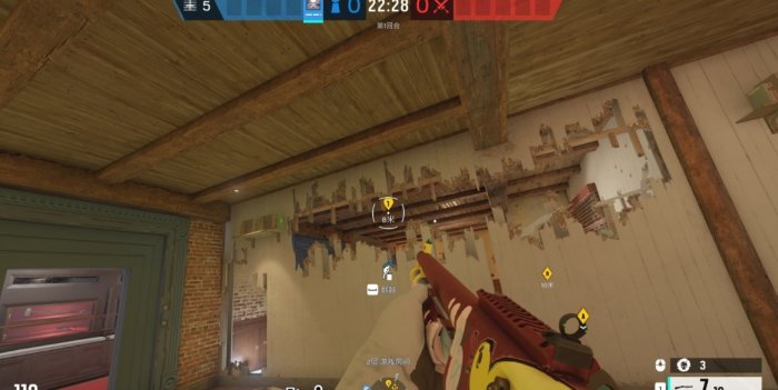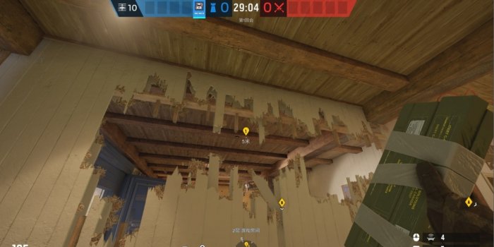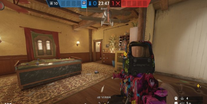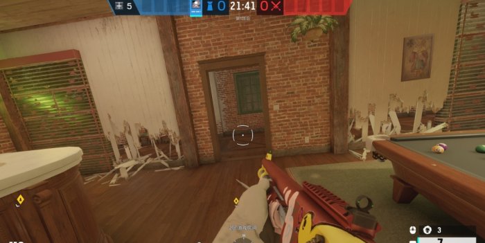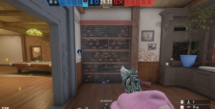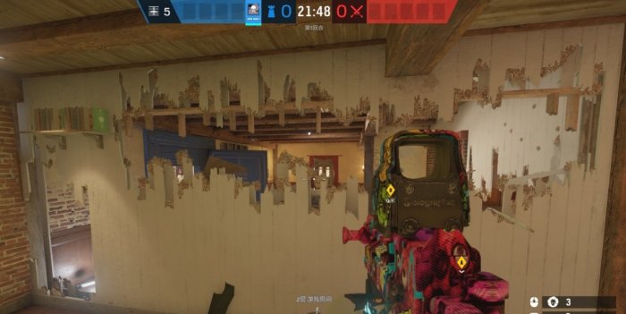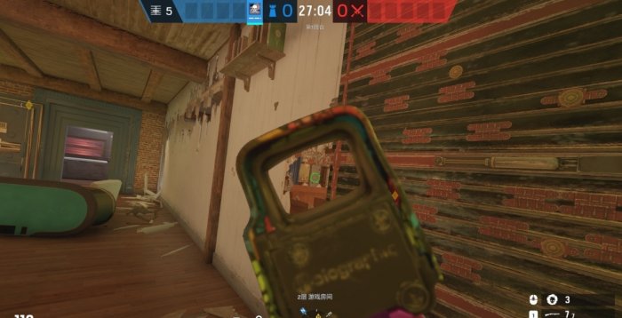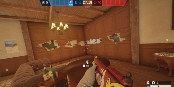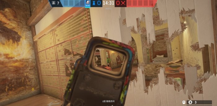 游戏间这四墙这里开的一排修脚洞是对90度方向和主梯方向欲打此处的攻方形成威慑即使打过来也能在吧台对这两个地方的攻方修脚。