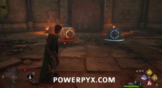 3、用【飞来咒】将方块放到地上,接着对左边方块使用【火焰熊熊】,对右边方块用【方块冻结】,后边的门就开了;