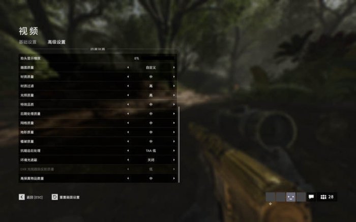 3、胶片颗粒关了,高级设置里把网格质量调低/中(敌人更显眼)