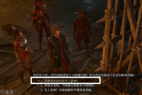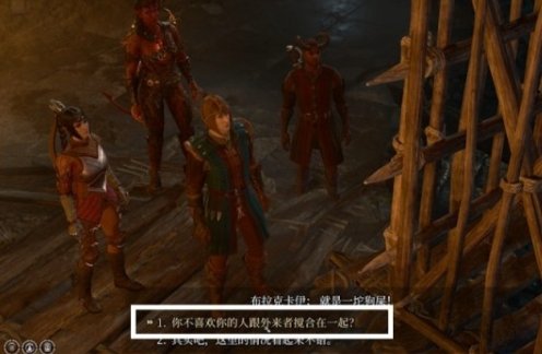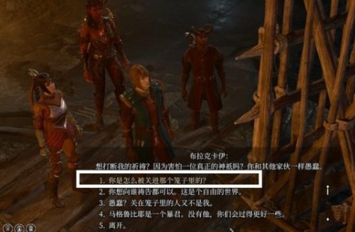 上前进行对话,从地精布拉克卡伊口中可以得知,他依旧保持着过去地精的信仰。第一个选项选1,可以得知他被关押的理由。接着选1了解详情。接着下个选项选1,顺着他的意思询问。这里需要注意,如果之前女祭司那打了烙印,这里是无法正常与布拉克卡伊对话的,可以选择未打烙印的角色进行正常对话