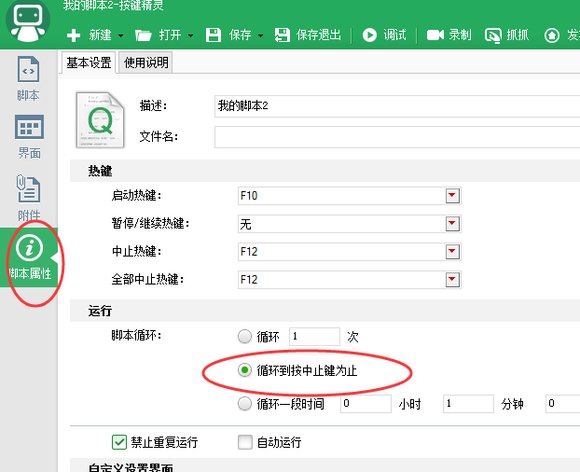 接下来需要点击左边脚本属性,勾选循环到按键终止,然后点击上面的保存退出