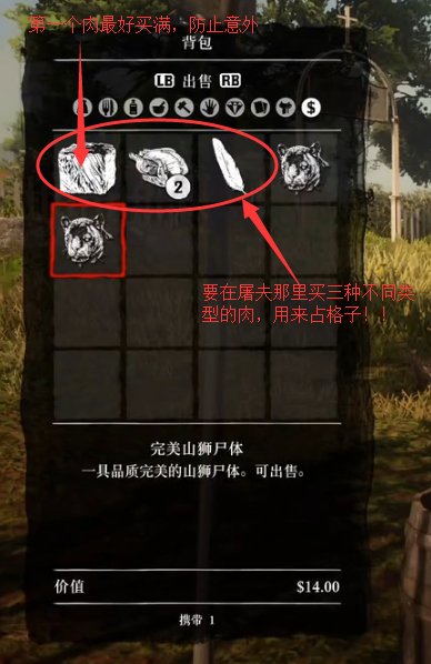 1.打一只三星完美大体型动物,尸体可以放在马背上的那种,一般是用三星狮子13.5$/三星山狮14$(如果实在打不到,可以用三星公鹿10$/三星狗鱼8$)