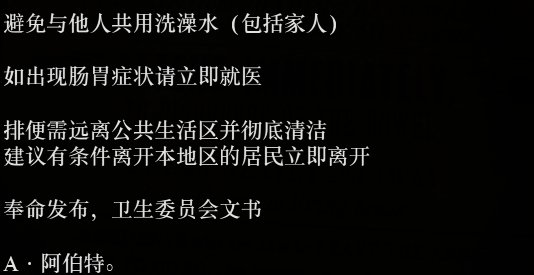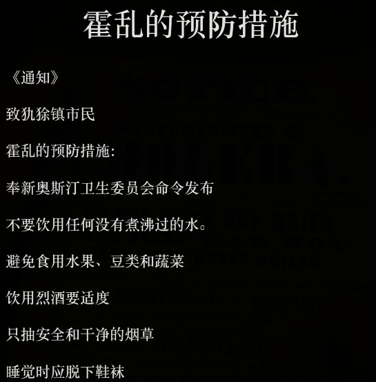 市镇小贩:“是的...几年前发生了猩红热,后来是沙漠瘟疫,接着是伤寒病,现在又是霍乱...真他//妈的糟糕。有人说整个小镇都被诅咒了,镇上的人都得了霍乱。给,你可以自己看。”