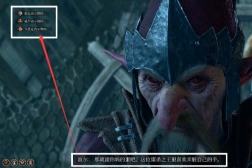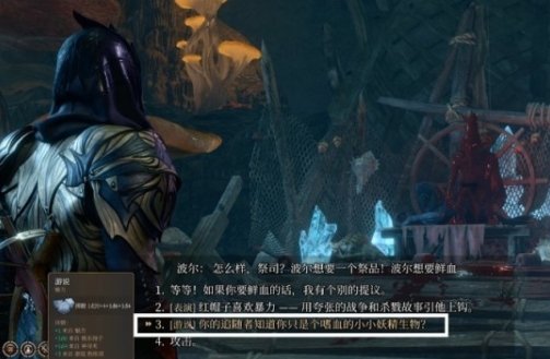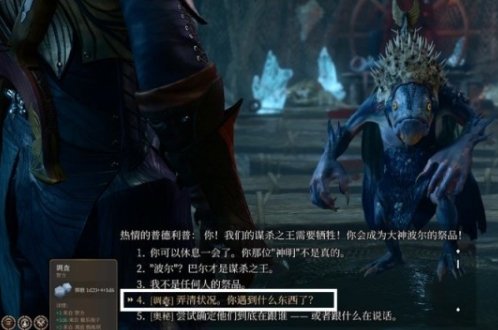 控制自定义角色上前触发剧情。通过自然检定可以得知这里的鱼人是以前夺心魔的玩具。第一个选项推荐选4调查,投骰子成功后可以得知,鱼人崇拜的只是红帽子妖精。接着下个选项选3游说,这样红帽子就会显出原形