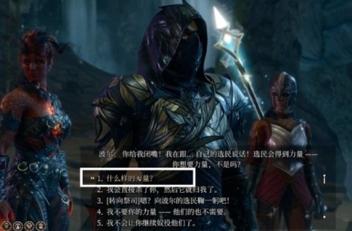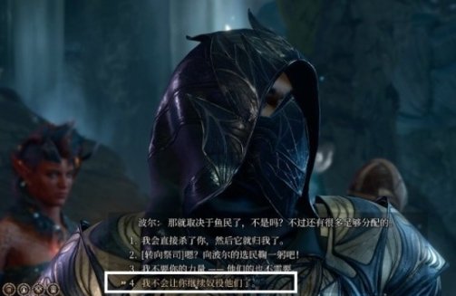 接着下个选项选1,了解更多剧情。接着下个选项选4,正义之士的正义之举,这样影心、威尔和卡菈克就可以获得好感度