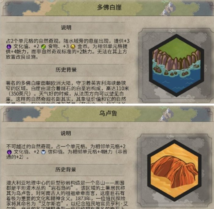 这两个自然奇观比较特殊,会给周围+4魅力,多佛白崖效果最为强大!本身就提供2个格子的巨大产出!而且刷新在海岸悬崖,就意味着能结合周围海岸,树,给予周围地块超高上限的魅力!