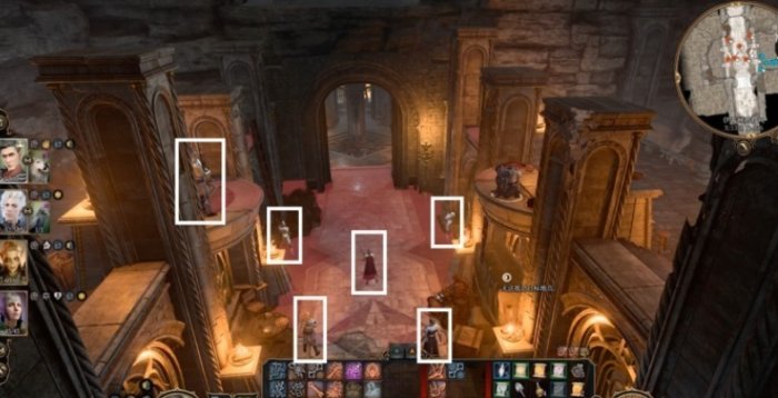 大厅过道总计6个敌人,下方5人上方1人。老规矩自定义刺客偷袭起手