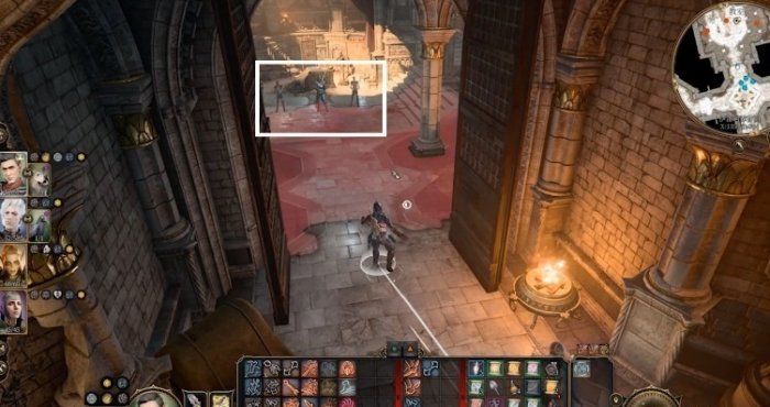 大厅战斗和道具拾取结束后,沿路朝北进入中间十字路口,接着往前就是训练室房间。而此时训练室的洋基人也处于敌对状态并全体面朝门口方向。从视野范围上可以看到,几乎无法常规隐匿偷袭