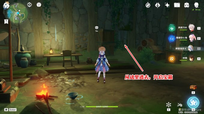 传送过去以后,我们就到了一个地下密室。根据桌上的留言所说,按照下图所示顺序,依次操作桌边的机关、水边的机关、火堆旁的机关、墙上角落的机关。