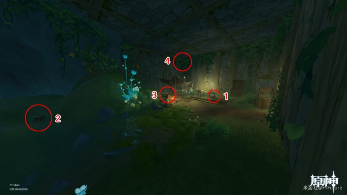· 藏宝图:位于「万水之源·大枫丹湖」下图所示位置,接近水底的遗迹上的的贝壳中,使用普通攻击将贝壳敲开,拾取里面的瓶子,即可获得藏宝图「秋的悔意」。