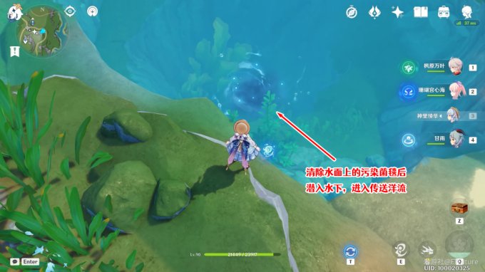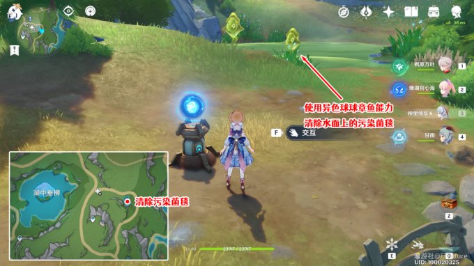 · 对应宝藏:拿到藏宝图后,到下图所示位置与「生态研究装置」交互,获得「异色球球章鱼」的能力,之后使用能力清除水面上的「污染菌毯」。