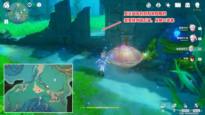 · 藏宝图:位于「万水之源·大枫丹湖」下图所示位置的贝壳中,但贝壳前面有透明屏障阻挡,需要绕到后面,从墙壁上的窗口进去,使用普通攻击将贝壳敲开,拾取里面的瓶子,即可获得藏宝图「利亚姆的高歌」。
