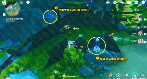 在碎石中,需要用异色重甲蟹的能力破开,打开普通的宝箱,获得线索【染有水渍的餐刀】。