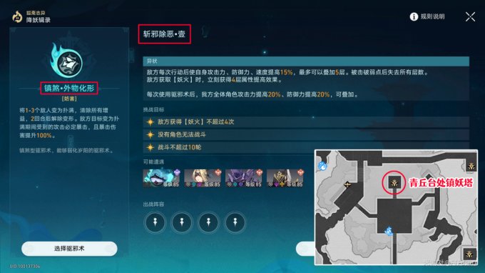 需要携带驱邪术「外物化形」来完成,推荐在「青丘台处镇妖塔」的第一关「斩邪除恶·壹」中进行。