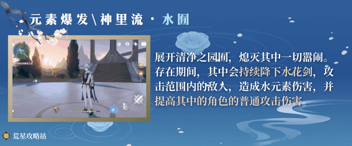 持续地降下水花剑,对攻击范围内的敌人造成水元素伤害,并提高其中角色的普通攻击伤害。