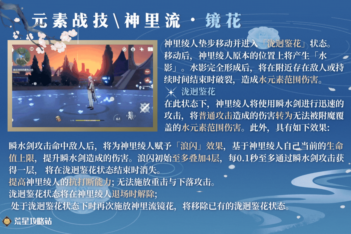 神里绫人的主要输出手段。使用后垫步向前并原地产生1道水影,水影将会破裂并造成1次水元素范围伤害,且神里绫人进入使用瞬水剑的强化普攻状态,攻击附带水元素附着且具有中范围对群的特点。
