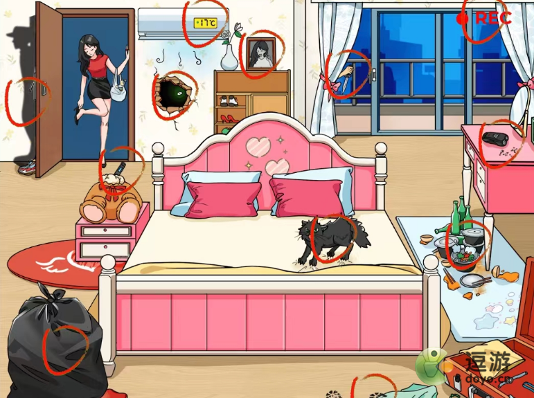 1、疯狂梗传独居女孩细思极恐是:惊吓黑猫(滑动床上被子)、录音笔(滑动玩偶熊的头)、窗帘藏人、剃须痕迹、黑白照片、饮食残渣、不明垃圾袋、门后人影、录像带、墙中眼睛、黑色鞋印、空调制冷中