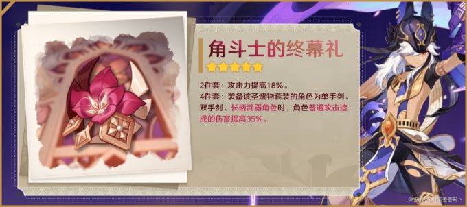 4角斗只对普通攻击有提升,而提供的伤害加成属于元素伤害乘区,赛诺最缺的一个乘区,所以该圣遗物套装也是可以使用。