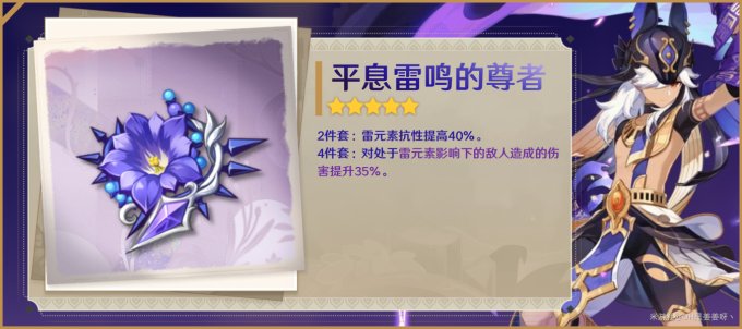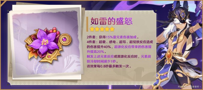 高练度不缺输出情况下可考虑佩戴4如雷,4件套效果可提高超激化的伤害增加比例(大约等同于50点精通提供的比例),触发超激化反应亦可减少其元素战技的冷却时间,可改善输出手法(有点手忙脚乱)。