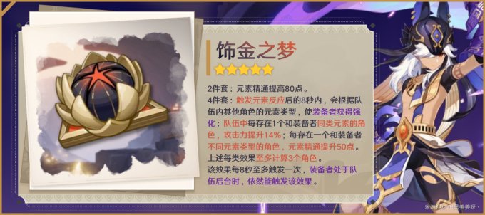 因此笔者推荐0命之座情况下推荐饰金之梦四件套,有「末途真眼」情况下施放元素战技即可,当然如果旅行者对于重击手感无所谓的话也是可以用如雷的盛怒四件套。1命之座以上就不用说了。在满命满精伤害溢出时,如雷四件套可以大大改善输出手法