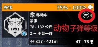 其中,子弹等级为3、5、7的动物,大多都是肉食性动物,种类相对较少且多为独居。3级一般是中小型食肉动物或中型食草动物,比如山猫、猞猁或傻狍鹿、山羊;5级为中型食肉动物,比如狼;7级为大型食肉动物,比如熊、咸水鳄。而食肉动物除了狼群,又基本都为独居动物,所以这几类子弹等级的猎物在地图中相对会比较少,且难遇到。